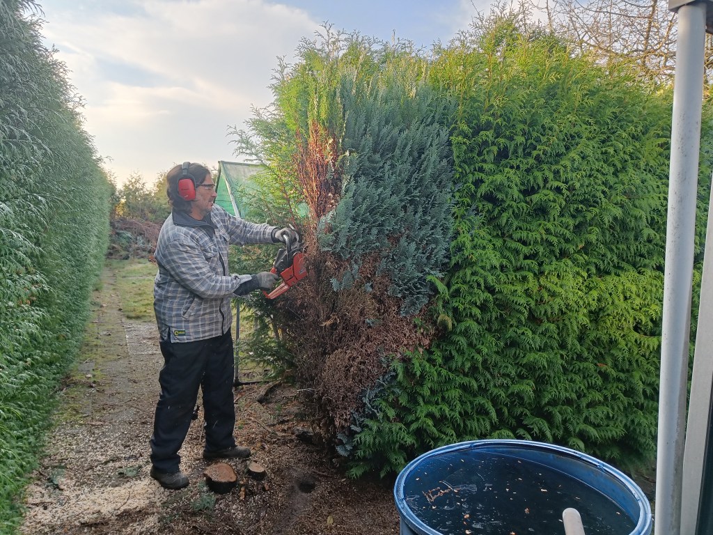 Mijn vader die met de kettingzaag de eerste rij coniferen te lijf gaat