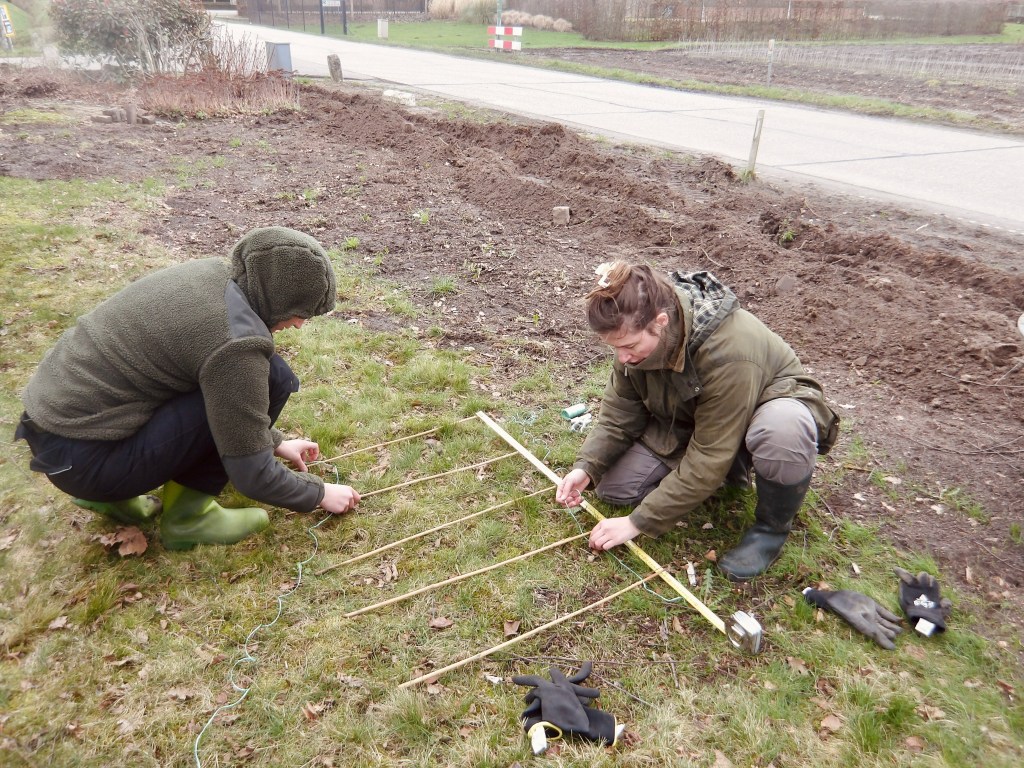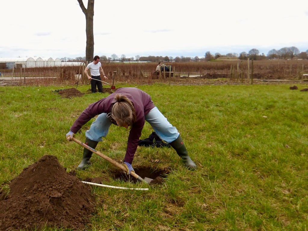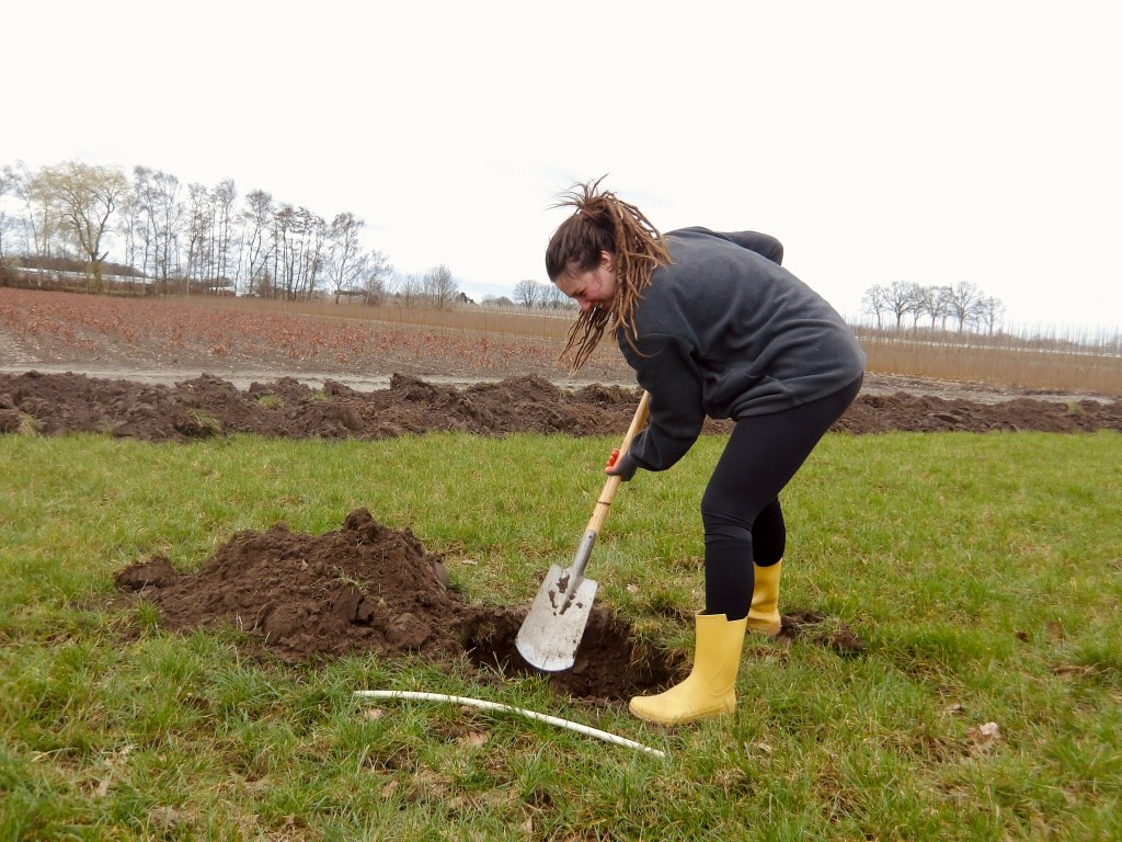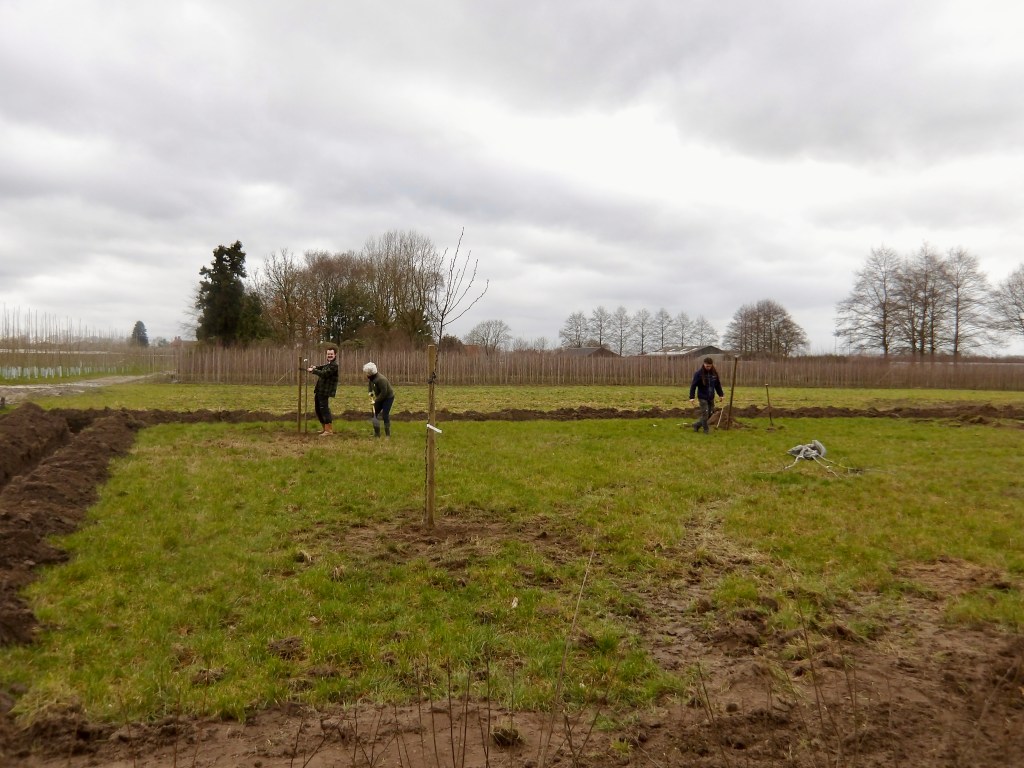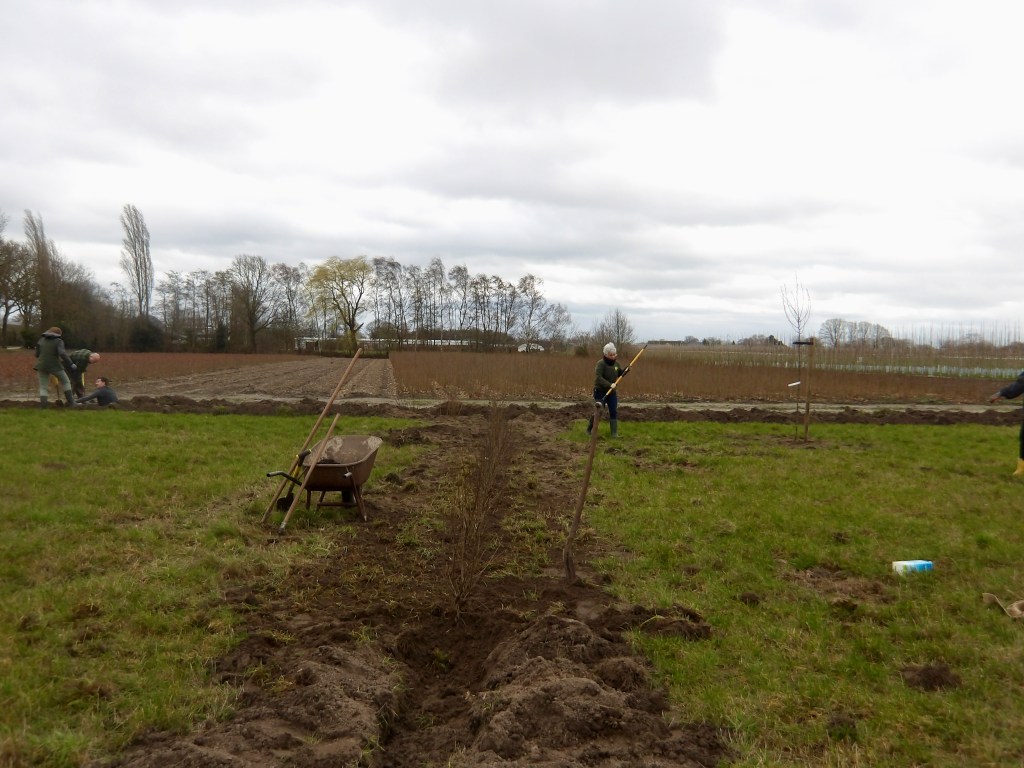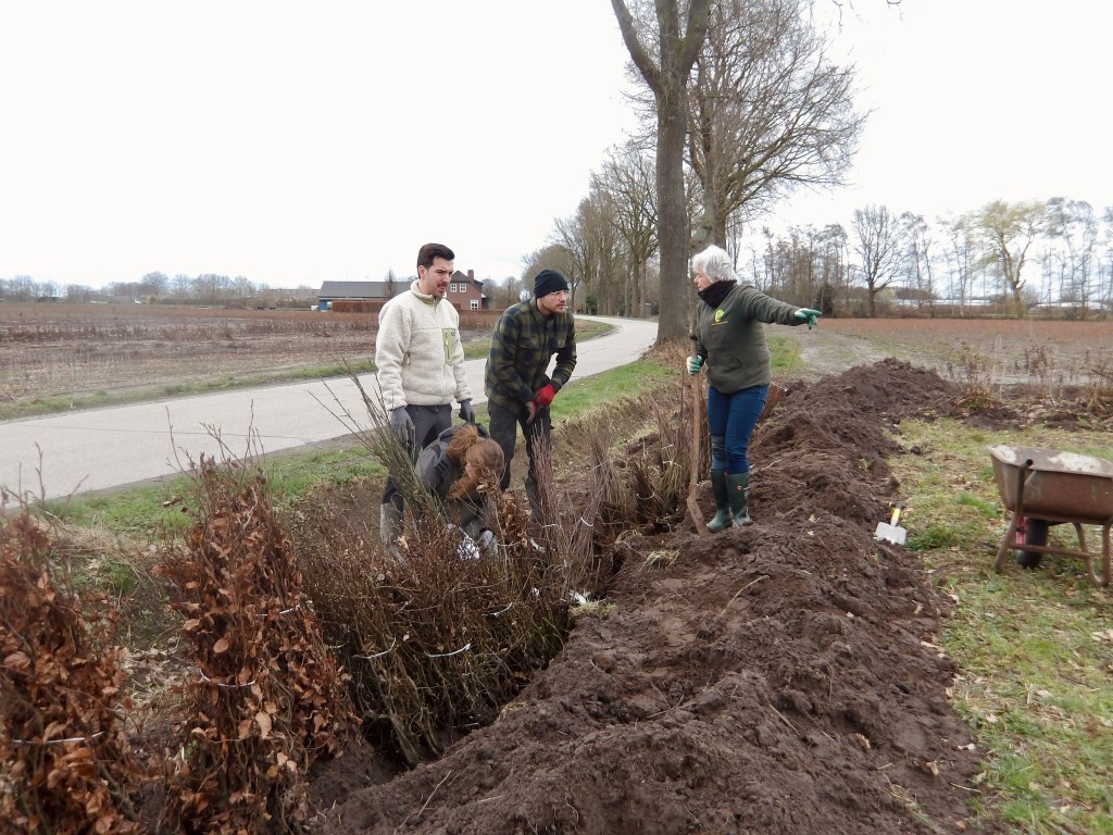 In het laatste weekend van februari zijn er maar liefs 1070 planten en bomen geleverd voor de aanplant van onze tuin. Totaal komt er 100 meter aan beukenhaag, 100 meter aan struweelhaag, 45 meter aan knip- en scheerheg, zes hoogstam fruitbomen en vier losse bomen. Ter voorbereiding lieten we met een kleine graafmachine gleuven graven op de plekken waar de hagen moesten komen. Met een tiental enthousiaste vrienden en familie hoopten we de klus binnen één dag te klaren. Of dat zou lukken, wisten we niet. Wij hadden immers zelf nog nooit een boom geplant en hadden geen idee hoeveel tijd de aanplant van 1070 planten en bomen zou kosten.