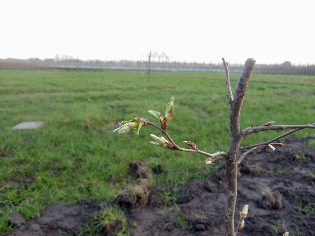 De afgelopen vier weken maken we iedere dag een wandeling door de tuin. Het voelt nu ook echt als een tuin, in plaats van een leeg grasveld. Met het zachte lenteweer lijkt er iedere dag veel te veranderen. De planten hebben kleine knopjes die uitkomen en ook de meeste bomen staan nog soort van recht. De komende weken zullen we goed moeten opletten of de regen de planten voldoende van water voorziet. Vooral de beukenhaag op coniferengrond krijgt met warm weer snel dorst. Dit weekend beginnen we ook met de eerste grassprieten verwijderen rondom de stammen. Het gras weghouden bij de aanplant zal hopelijk zorgen voor een goede start.