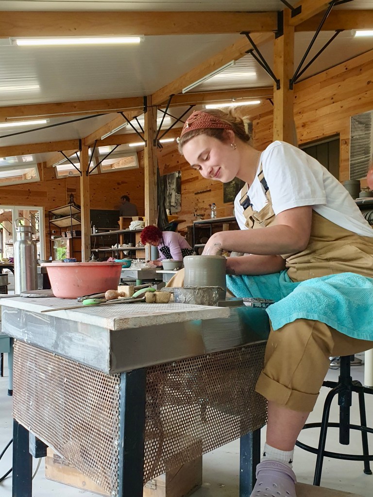 Je koffie drinken uit een eigen gemaakte mok, wie wil dat nou niet? In 2020 ben ik begonnen met pottenbakles. Als je mij toen had gevraagd wat voor pottenbakker ik nu, 6 jaar later, zou zijn, had ik waarschijnlijk een heel ander beeld geschetst dan de werkelijkheid. Mijn theemokken zijn van espressoformaat, borden zijn niet rond en geen een mok is hetzelfde (hoe hard ik het ook probeer!). Pottenbakken is frustrerend en dat maakt het avontuur des te leuker. Sinds kort heb ik een eigen draaischijf en een kleine oven te leen. In de grote kas wil ik (zolang de hitte me niet uitdrijft) een kleistudio maken. De ontwikkeling hiervan houd ik bij op de pagina ‘Keramiek’.